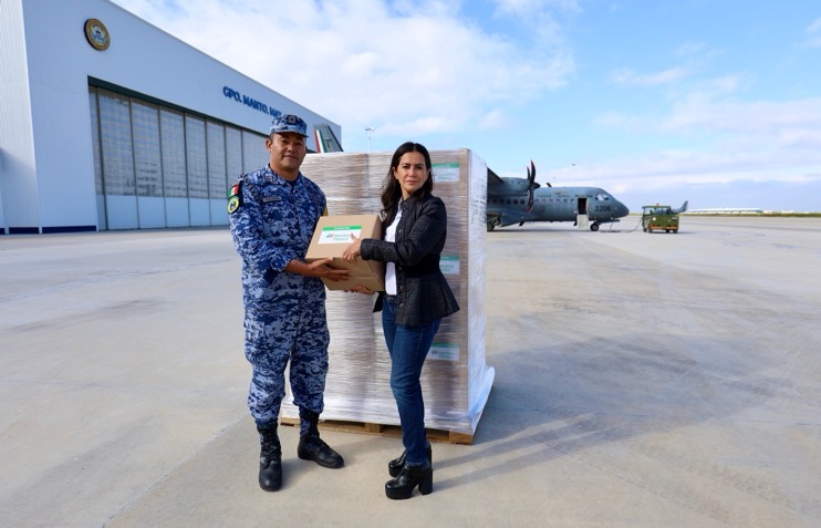 Somohano hizo la entrega de despensas al mayor Juan Diego Uscanga Muñoz, responsable del Hangar de Acopio de la Base Aérea Militar Número 1, en Santa Lucía, desde donde serán enviadas al puerto de Acapulco para su distribución entre la población damnificada.