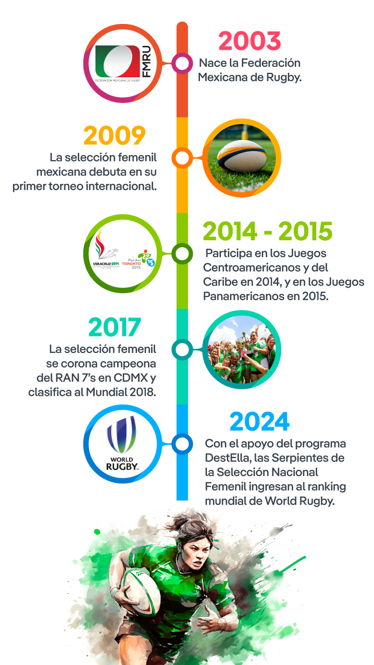 Fue así que, en 2014, la selección de rugby femenil de México —las Serpientes— participó, por primera vez en los Juegos Centroamericanos y del Caribe, que en esa ocasión se disputaron en Veracruz, México. Al año siguiente, en una carrera que ya daba señales de imparable, el equipo llegó a los Juegos Panamericanos en Toronto, Canadá.